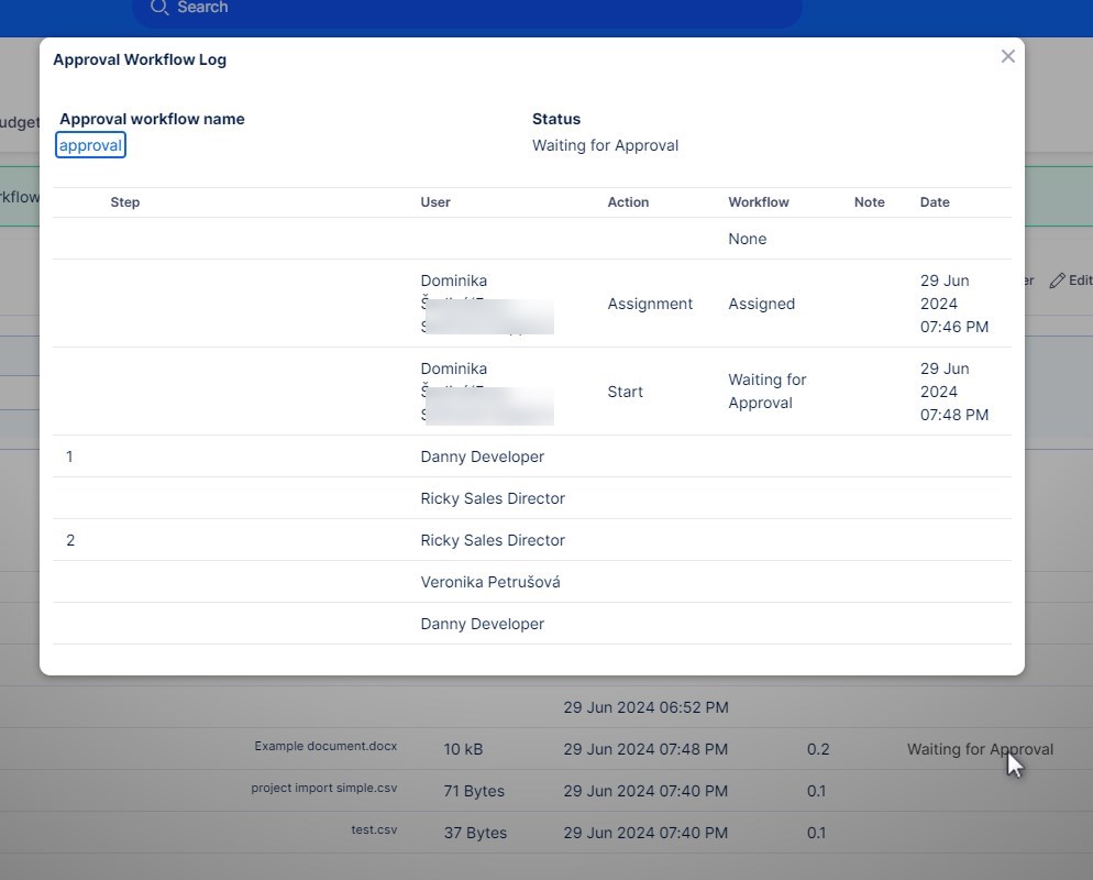 All workflow approvals are stored and are available in the log. You can open the popup by clicking the workflow status text: