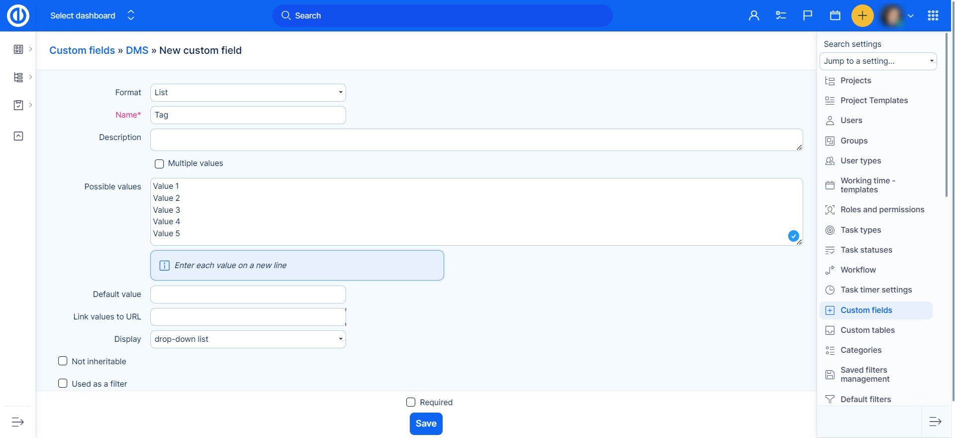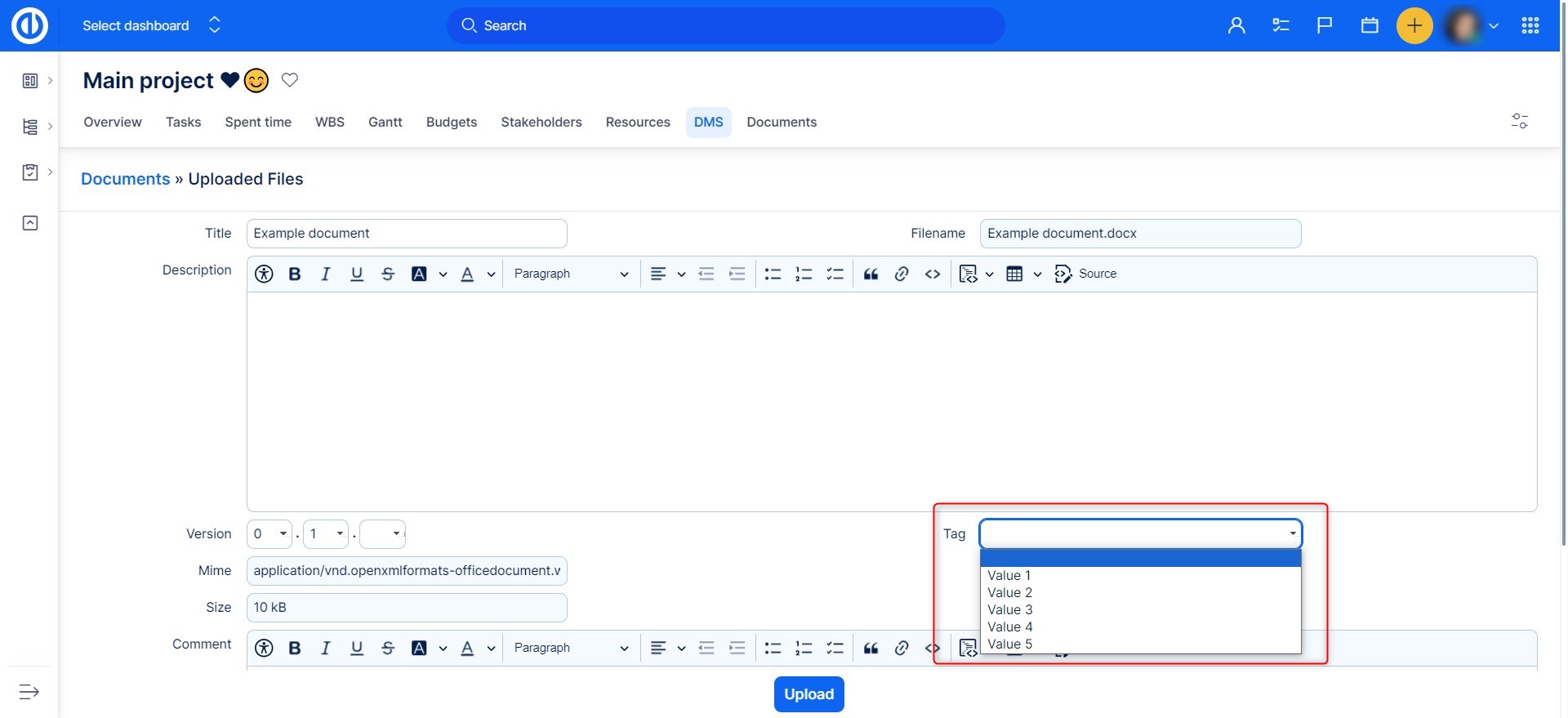 In order to use Documents tagging feature let's add a new DMS custom field named Tag as a list with possible values specified according to your requirements.