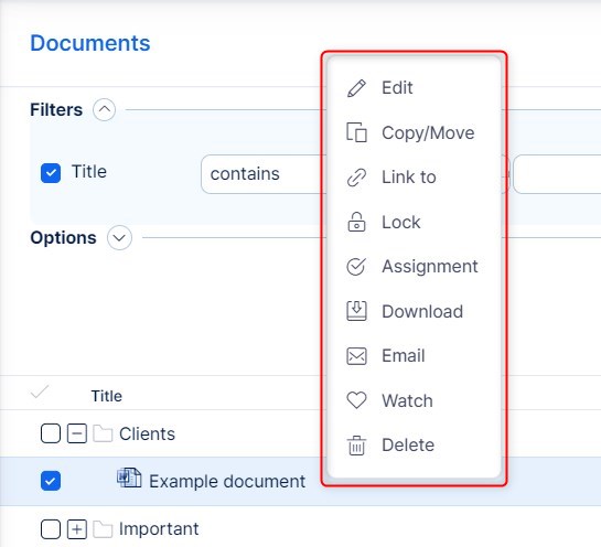- File manipulation Documents can be uploaded, locked, or unlocked. Email notifications can be switched on/off. Approval workflows can be applied. Symbolic links can be created/deleted.