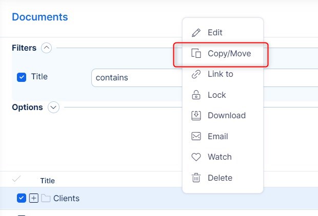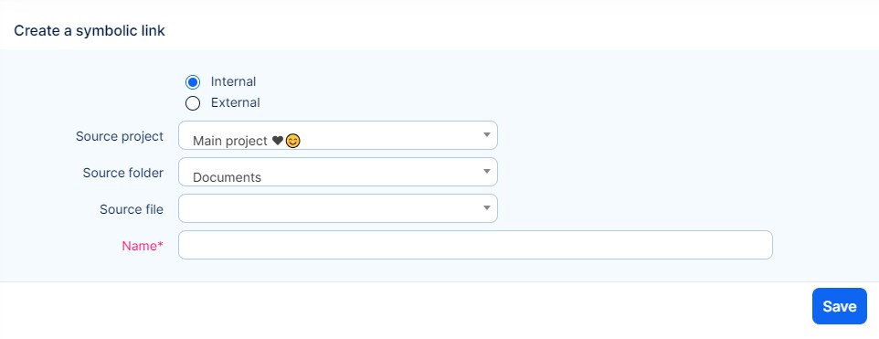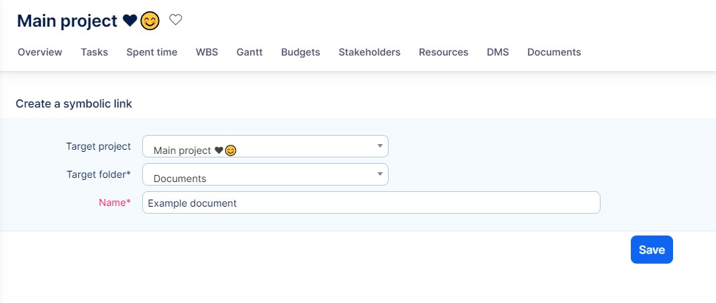 There is possible to create a link to another document or folder from the same or another folder of the same or another project. Links behave as if operating directly on the target document or folder. It means for example that if you download or email a link, the referenced file is sent to the user.