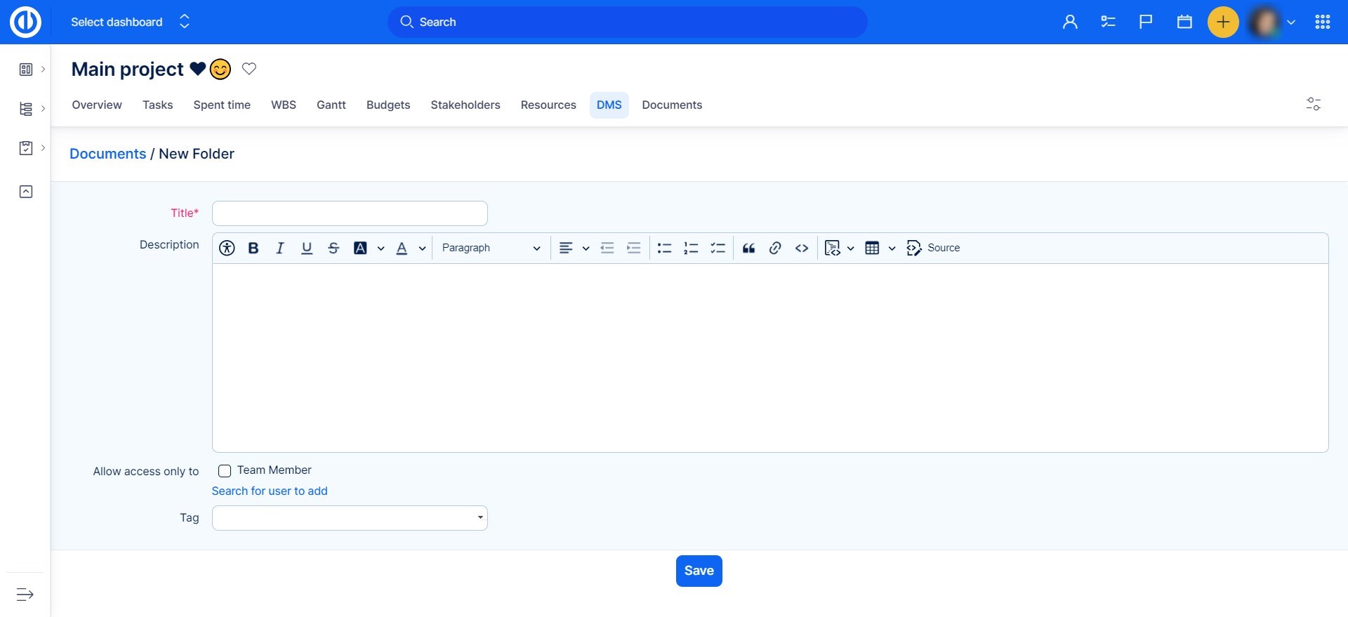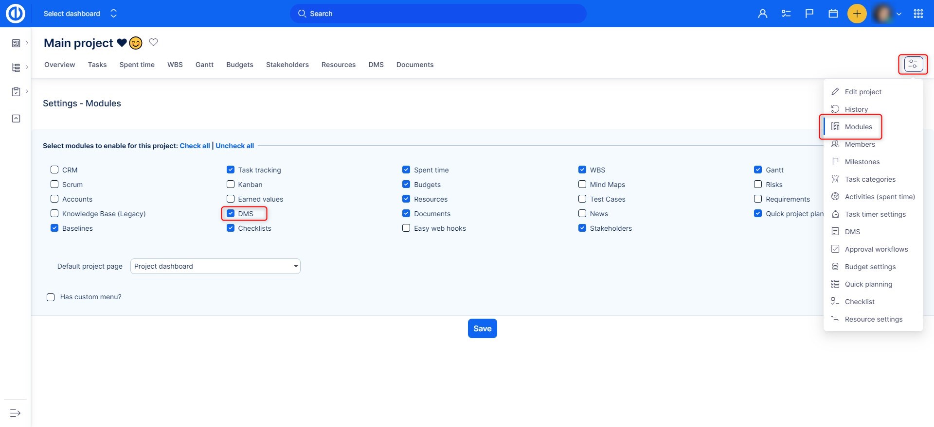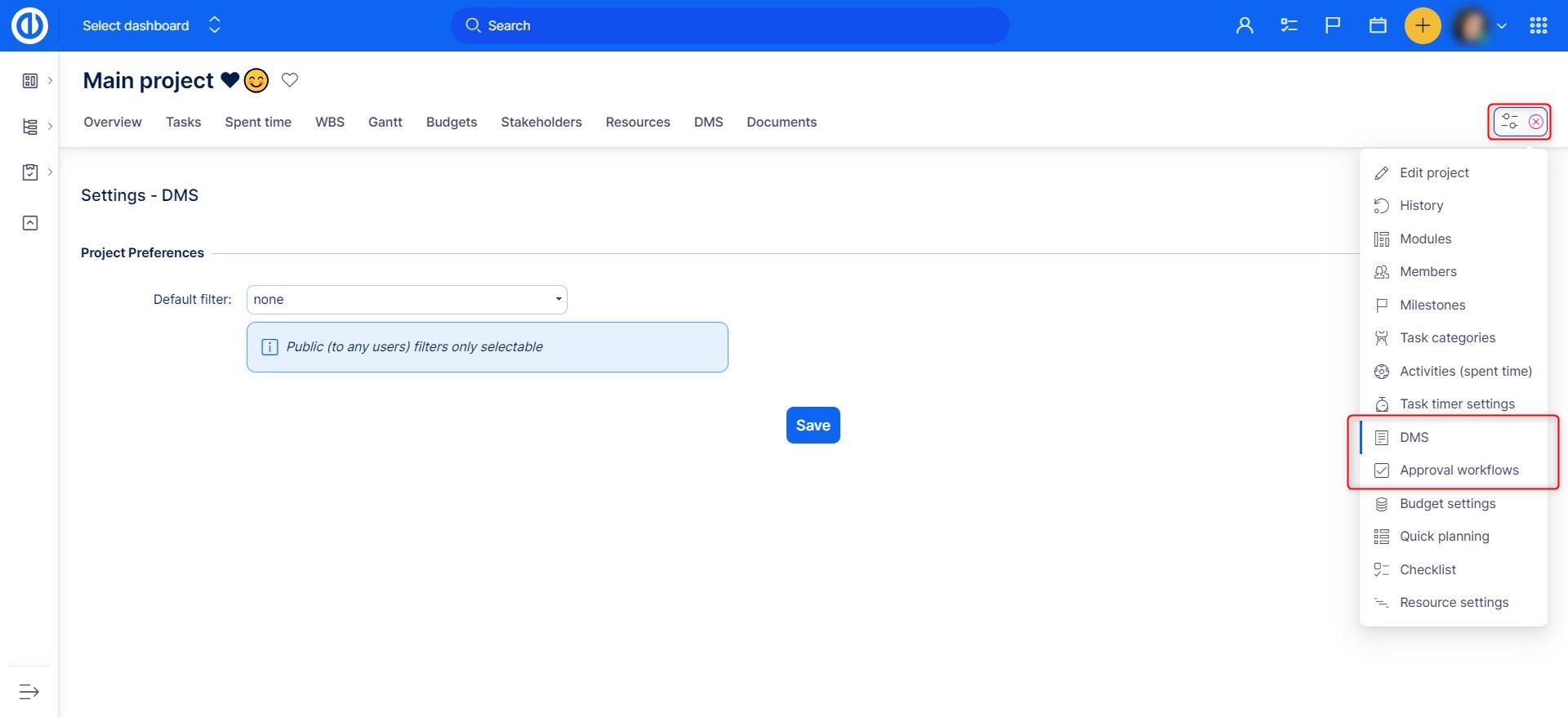 I order to make Easy DMS available on a project, it is necessary to have checked the corresponding module in the Modules tab. To do so, go to the particular project's Settings >> Modules - tick "DMS" checkbox and click on Save. Immediately after, Easy DMS and Approval workflows tabs will appear in the top menu of the particular project as illustrated below. Each project member with corresponding permissions can set email notifications related to DMS documents and folders of the project.