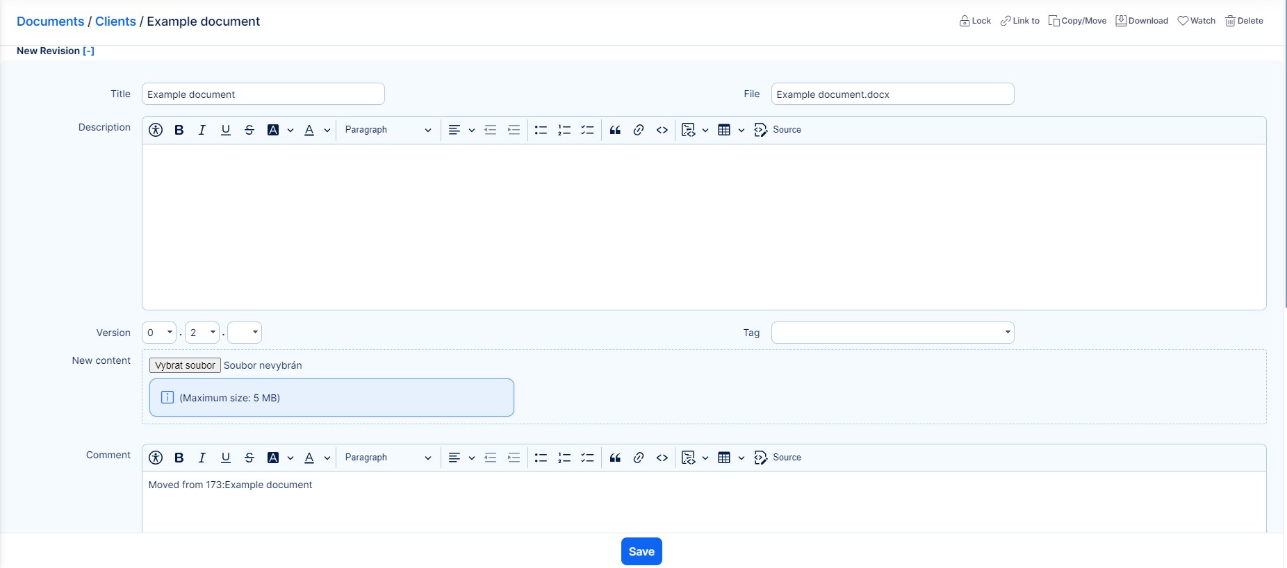 You can change the title, description and add a new comment. If you add a new file (New content), a new version will be automatically assigned to it. It can be either a minor version (if the previous version was x.1, the new version will be x.2; usually for minor changes in the document), or a major version (if the previous version was 1.x, the new version will be 2.0; usually for extensive changes in the document).