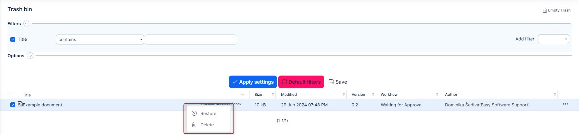 If documents or folders are deleted by a user, they are moved into the Trash bin only in fact and can be restored again or definitively removed from the Trash bin with Delete documents permission. The Trash bin is available from the main DMS menu. The user interface of the Trash bin is very similar to the documents view except command icons. New command icons for restore and delete a folder or document are next to the deleted folders a documents. Once a document or folder is deleted from the Trash bin there is no way back!