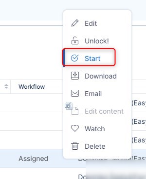 To start the already assigned approval workflow, click the Start button in the context menu.