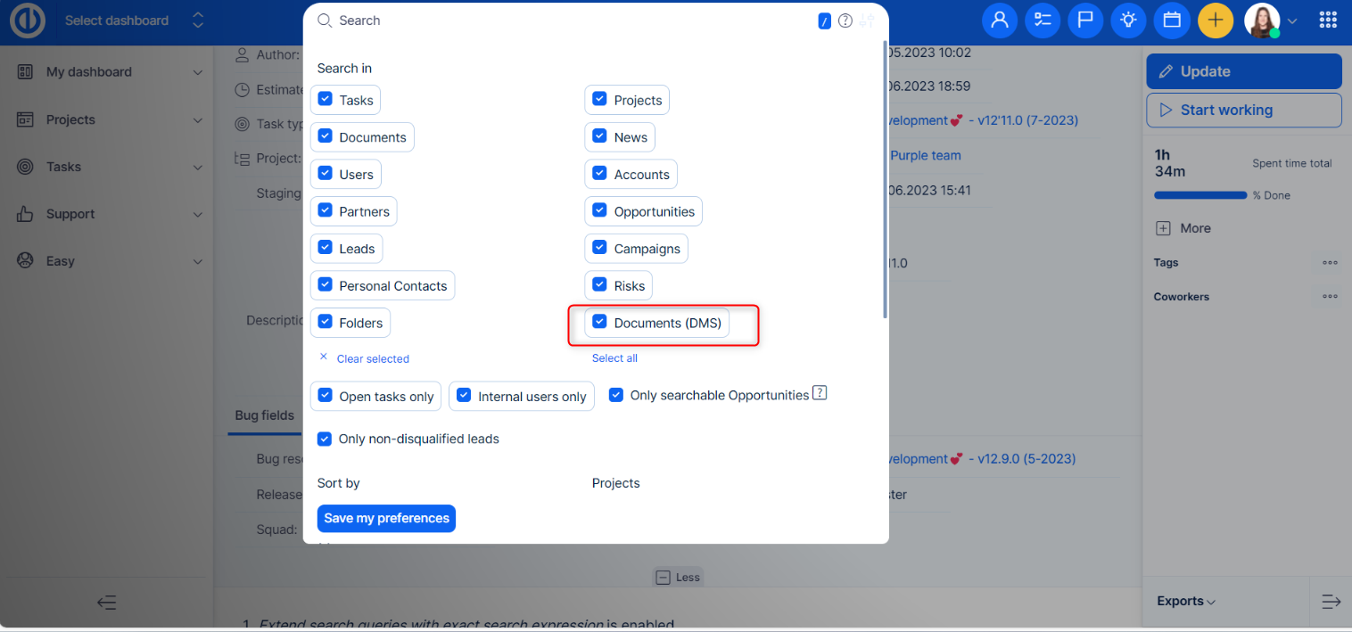 DMS full-text search is readily accessible in the documents by simply clicking the "Documents DMS" checkbox at the advanced search menu.