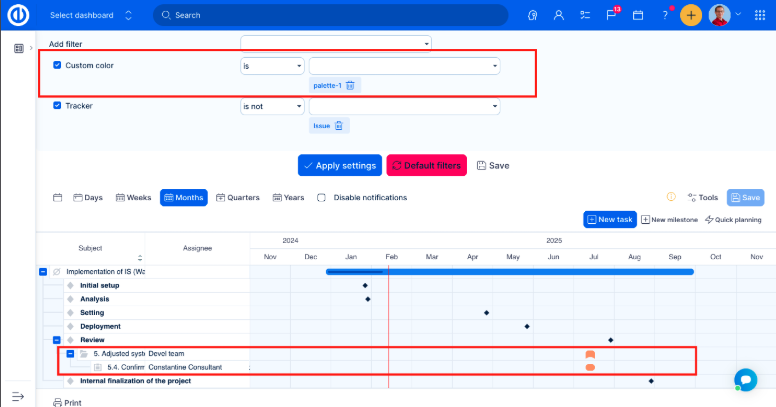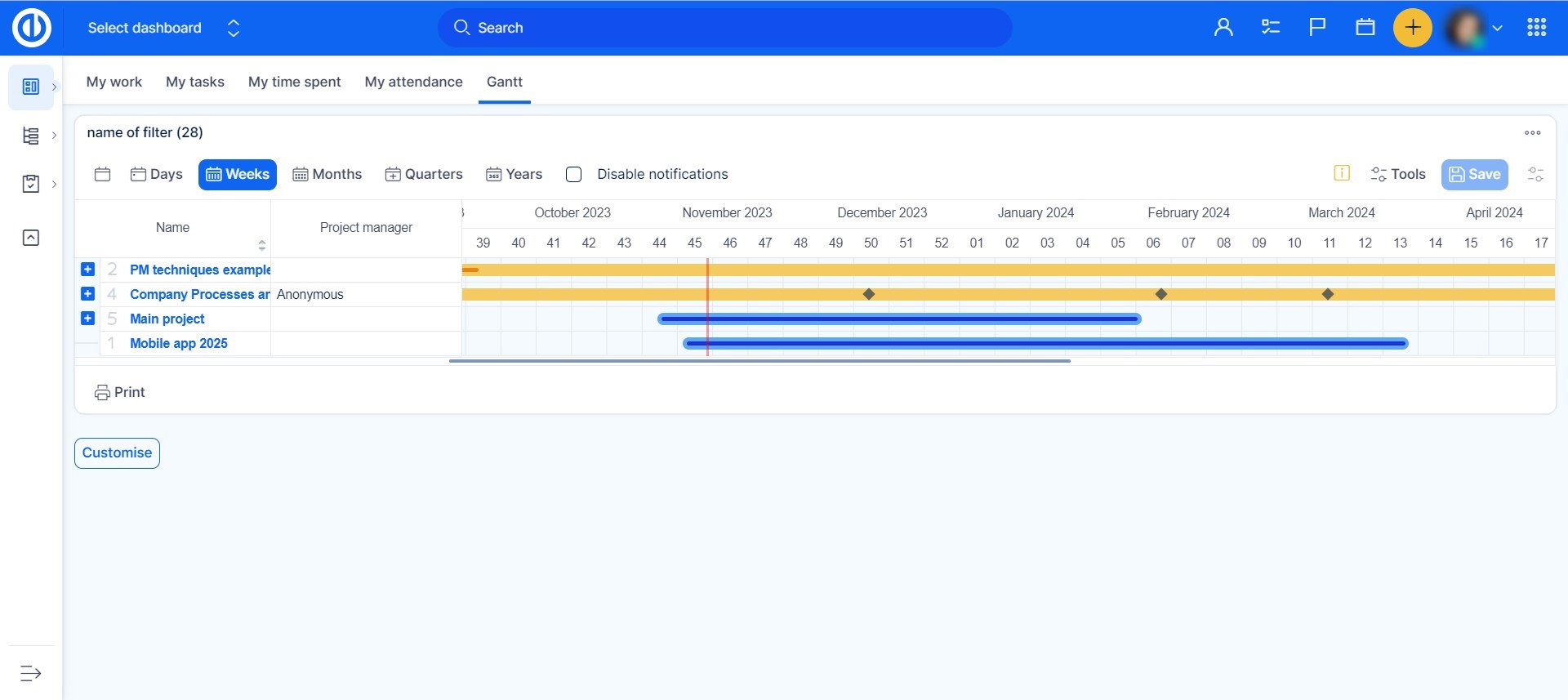 Customize your filter settings and visible columns in a moment. Project-level Easy Gantt supports both task filters and project filters, while global-level Easy Gantt supports project filters only. It's because global Easy Gantt is supposed to be used only when working with projects, not with tasks.