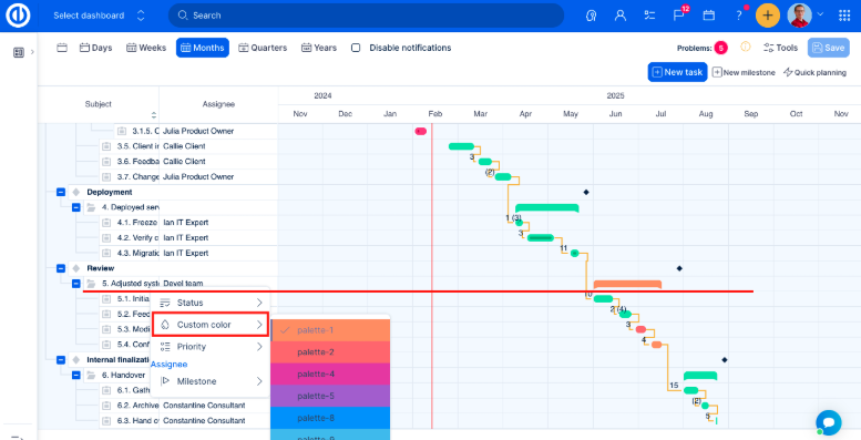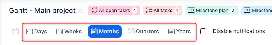 The timeline offers various types of view: days, weeks, months, quarters, years. Based on the project length and the necessary level of detail, they can be switched between from the top menu.