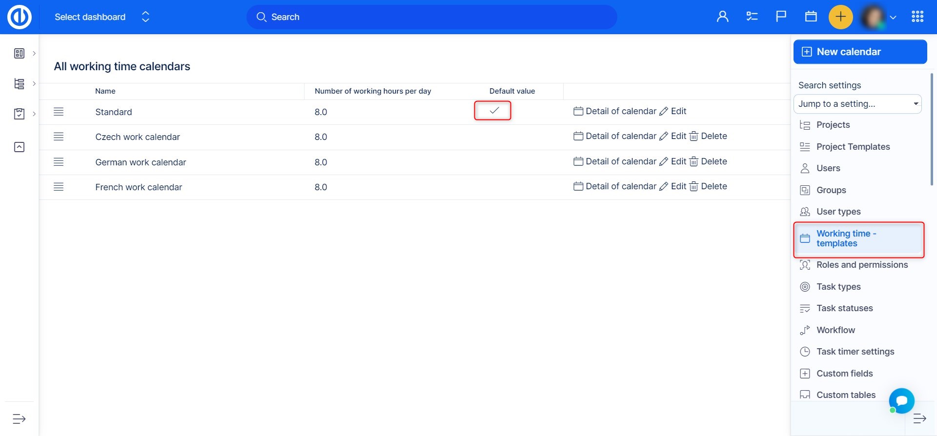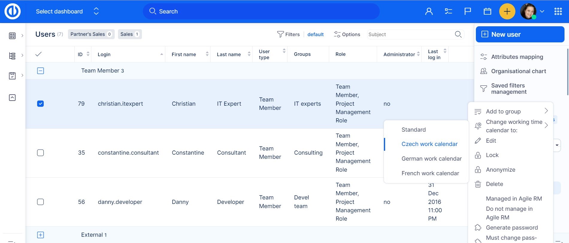 Normally, each newly created user automatically gets a default working time calendar template, which can be found and changed in Global menu >> Administration >> Working time - templates. However, if you make a change in this default template, this change will not apply to already existing users unless you manually reset their personal working time calendars according to this new template. To make the reset, mark the required users on the users' list (More > Users) and select "Change working time calendar to" option from the context menu (right mouse button).