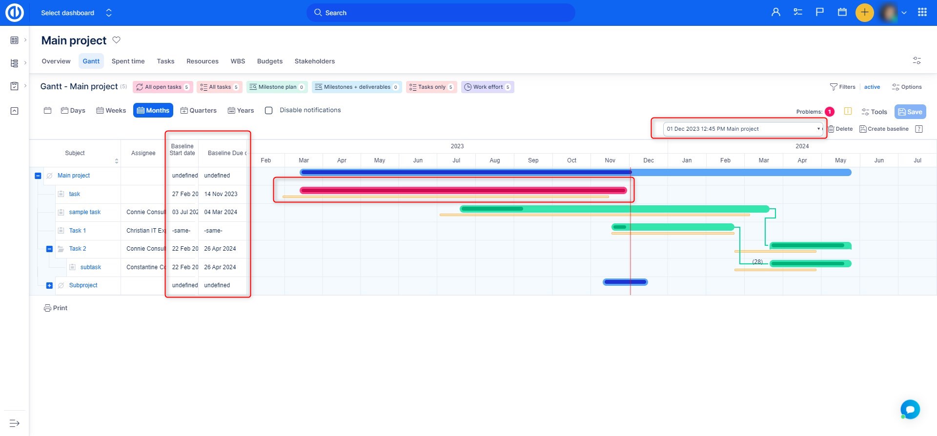 - Baseline is technically a copy of the project, and this copy is then used to display data as a snapshot. This means some limitations are applied : When a baseline is created, tasks from subprojects are not being copied, thus will not be part of the created baseline.