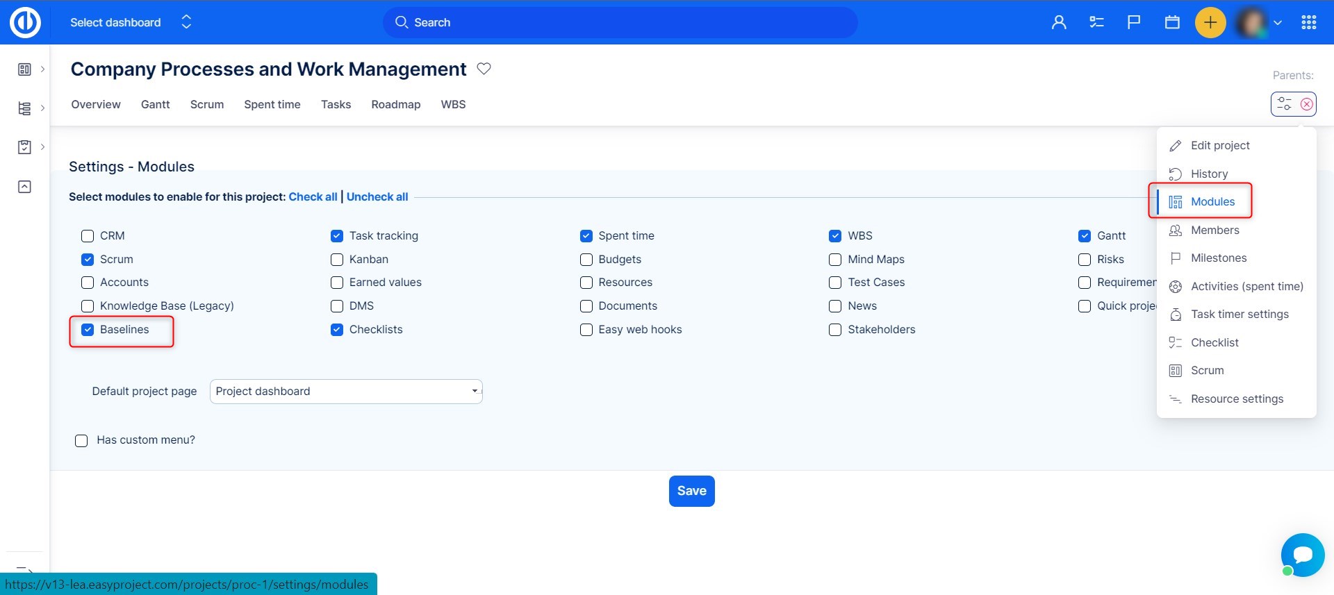 In project management, a baseline is the project's original plan. This original plan is visualized in order to compare it to the current project plan. Easy Gantt offers this feature of highlighting the baseline plan. Baseline plan does not change when the schedule is edited. Redmine Gantt chart allows you to create more baselines which thus work as the snapshots of the project plan. Before start using Baselines, you need to have the module enabled in your project settings as shown in the image below.