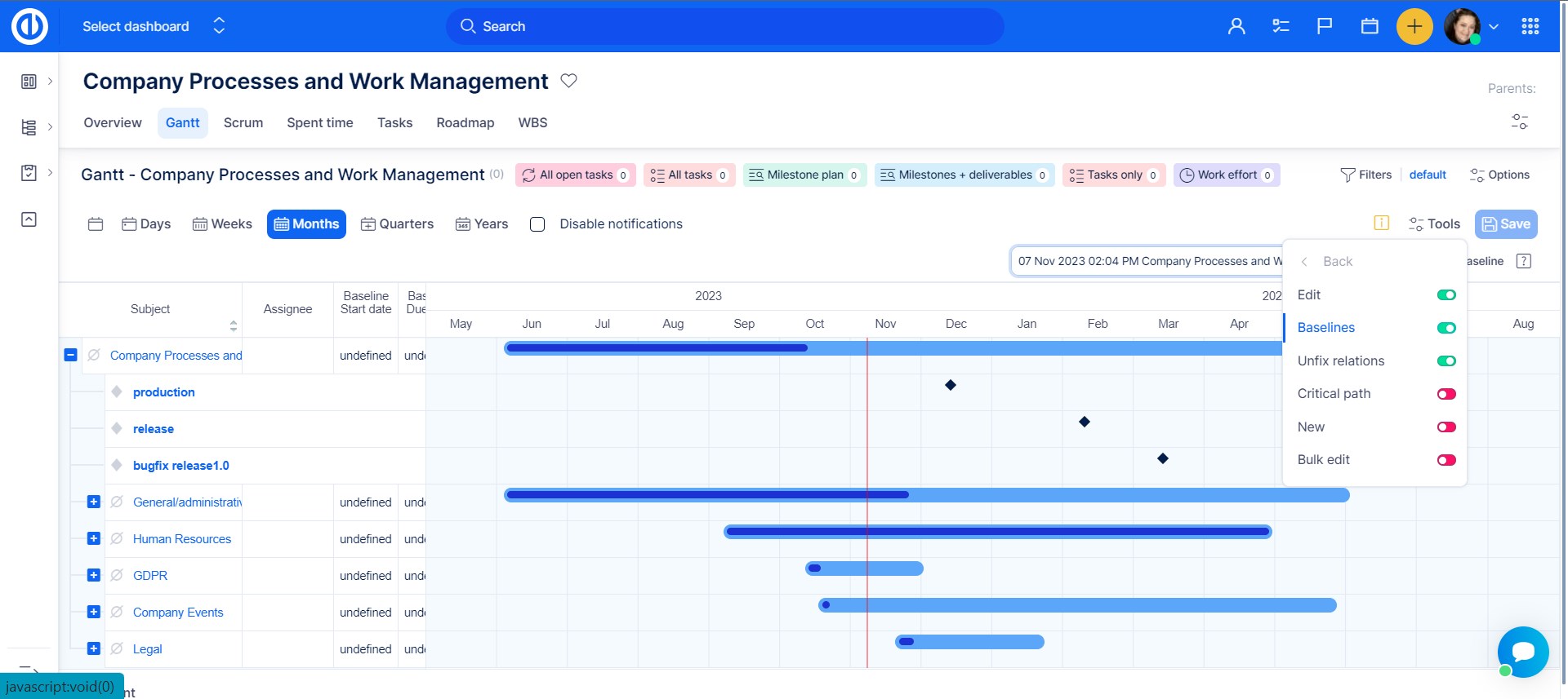 Immediately after activating the module, Easy Gantt tab will appear in the top menu of the particular project. Click on it and Easy Gantt will open. Using the functionality on the project level is a better choice for the users who need to work on the particular project only so there is no need to see entire project tree as on the global level. Another difference is that Easy Gantt on the project level is more customizable as you can easily switch between various types of view such as default, baselines and critical path, which is not possible on the global level. If you open a parent project in Easy Gantt, also its subprojects and their tasks are displayed in addition to the selected project.