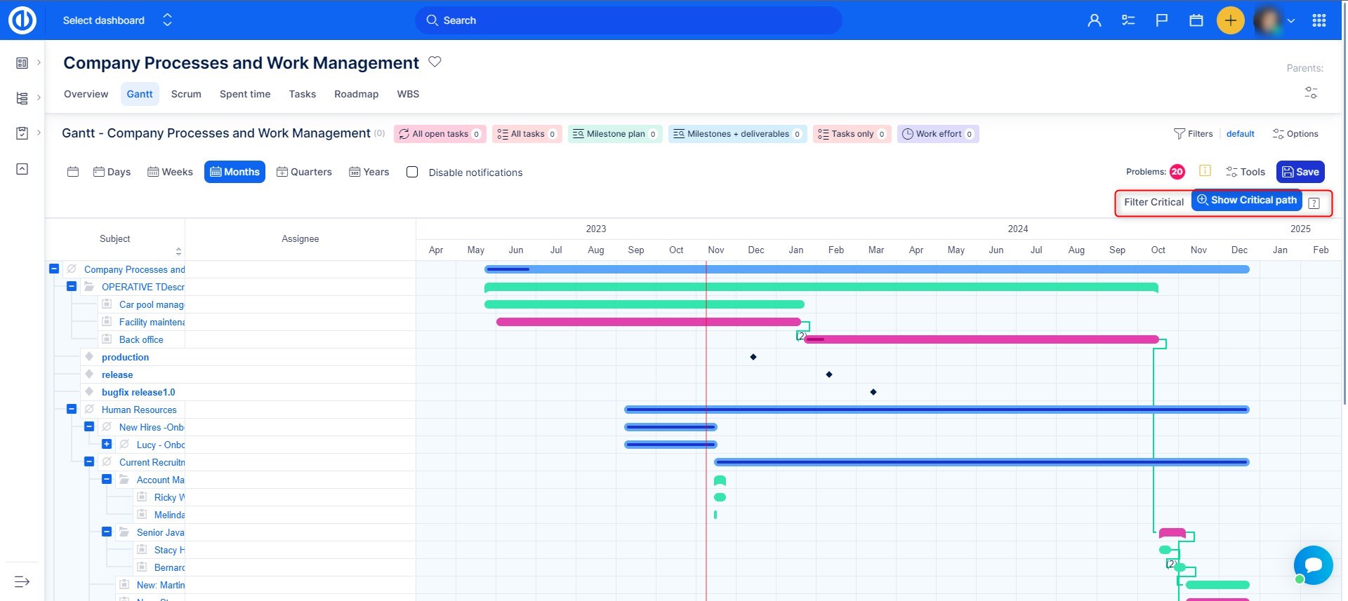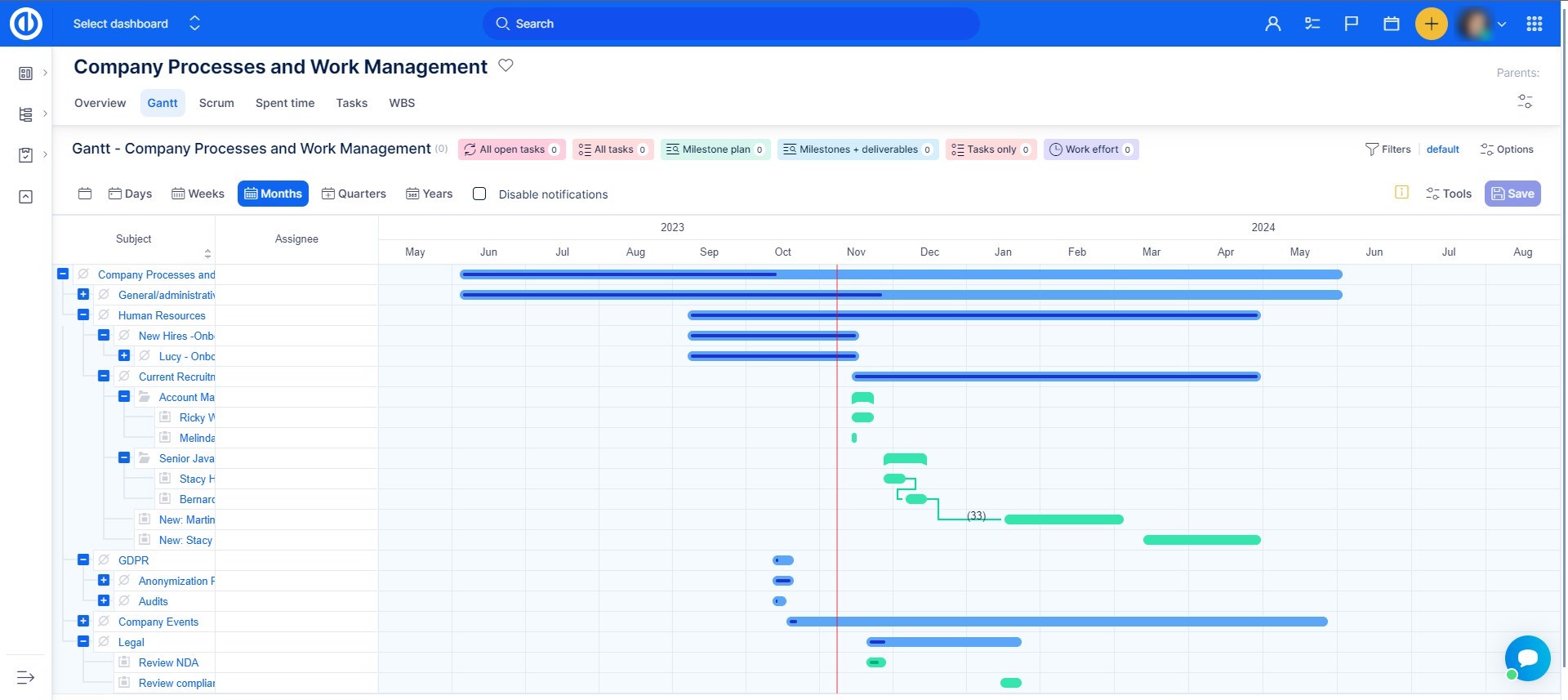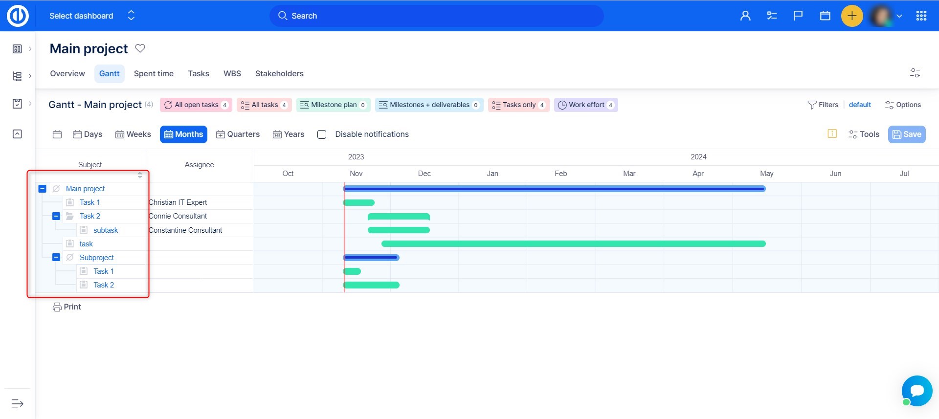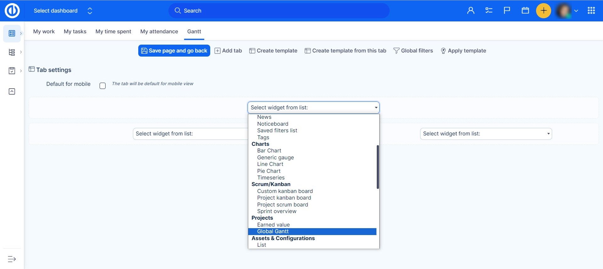 - There can be only one Gantt widget on dashboards (homepage, project overview, etc.). This includes widgets: Easy Gantt, Resource management, Personal Resource management - if one of these is active, no other will be shown on the same page. This is due to page loading speed. A workaround is to put these widgets on different tabs of customizable pages.