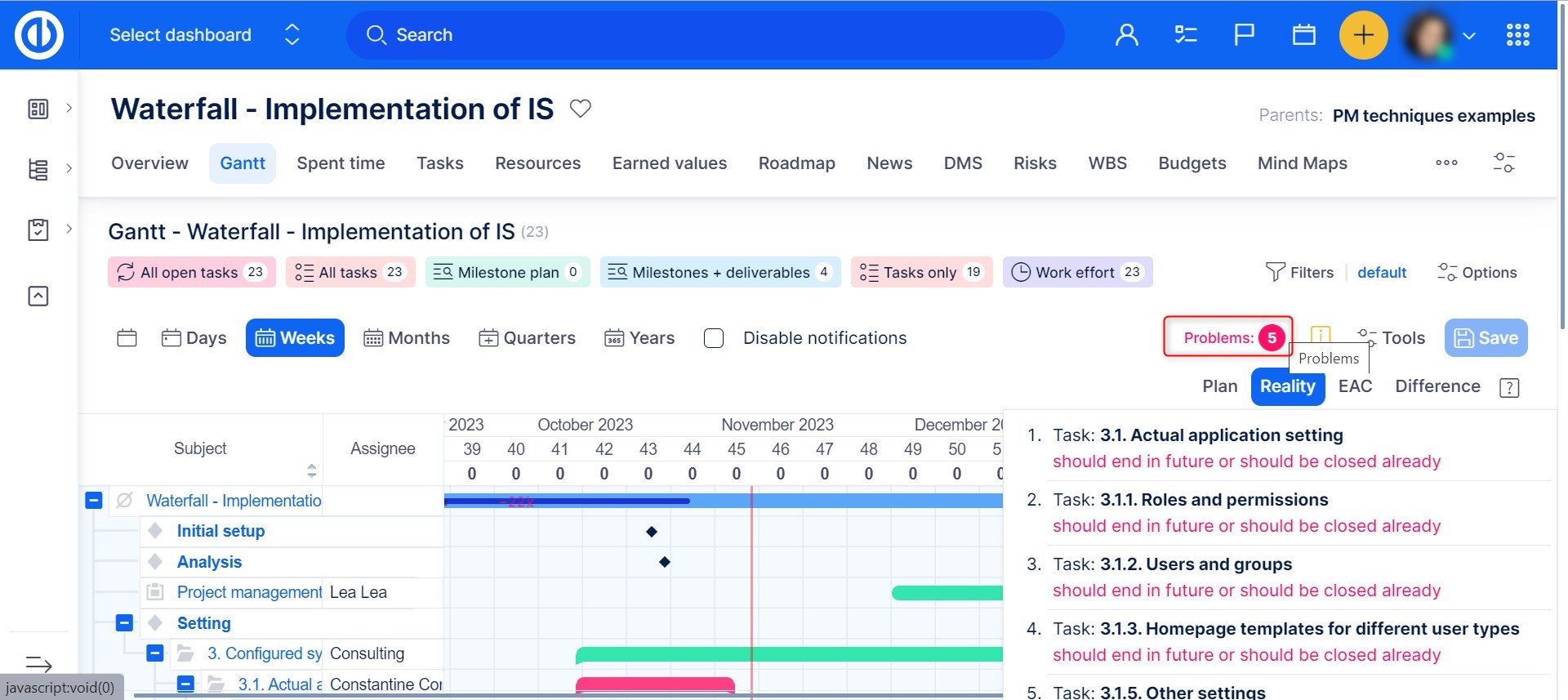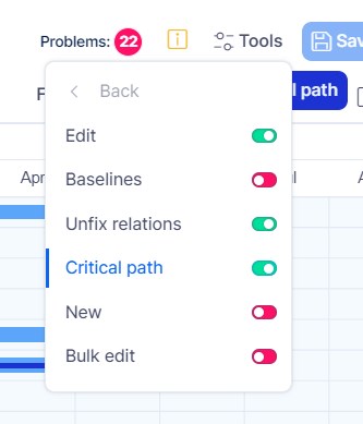 The Problems button can be found among the main controls at the top right but it only appears when there are some problems found. The button is complemented with a number that represents the number of problems identified as illustrated below. Clicking on the button expands the list of the problems including the names of affected tasks and short explanations. These list items are links so you can click on any and that will highlight the respective task on the timeline. Clicking again on the button collapses the list.