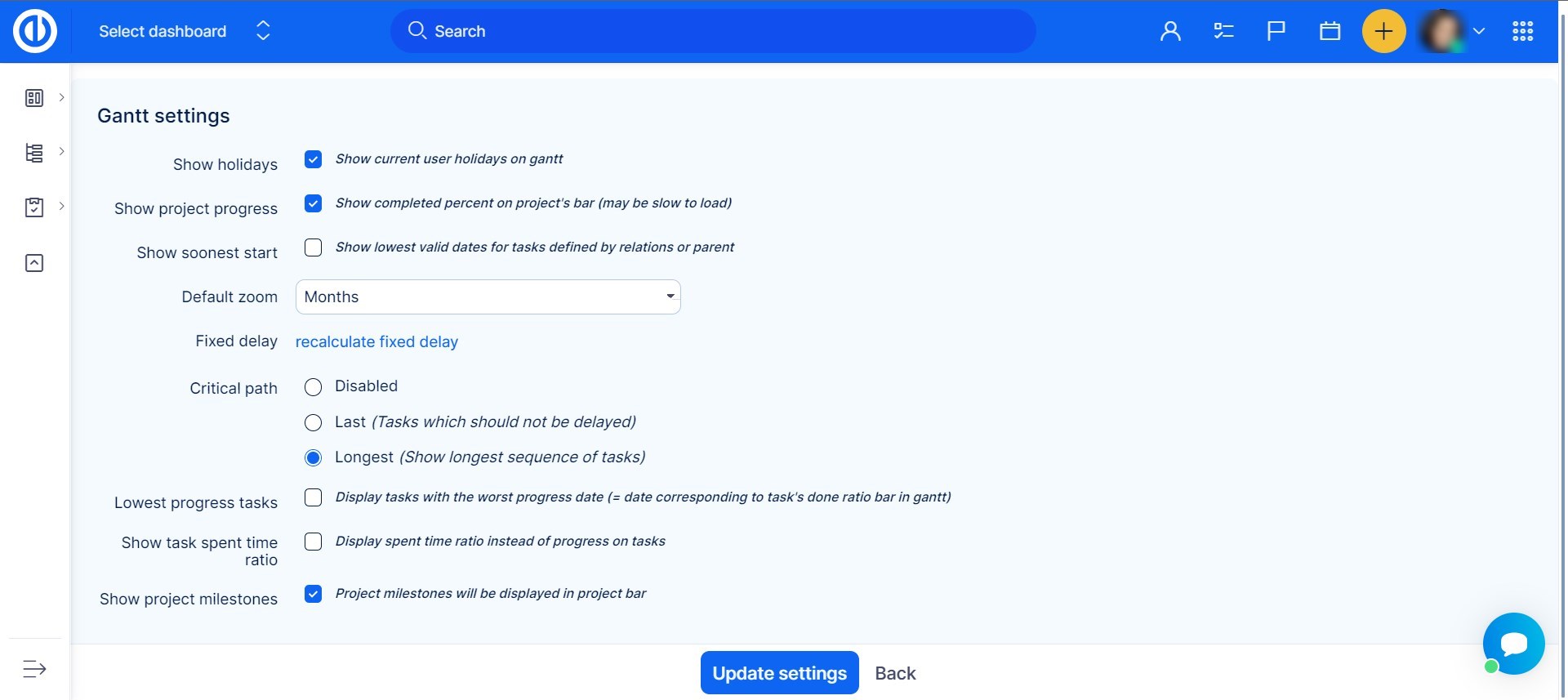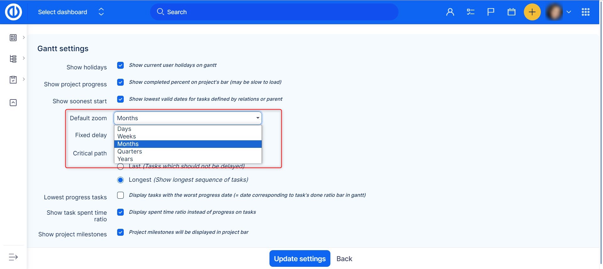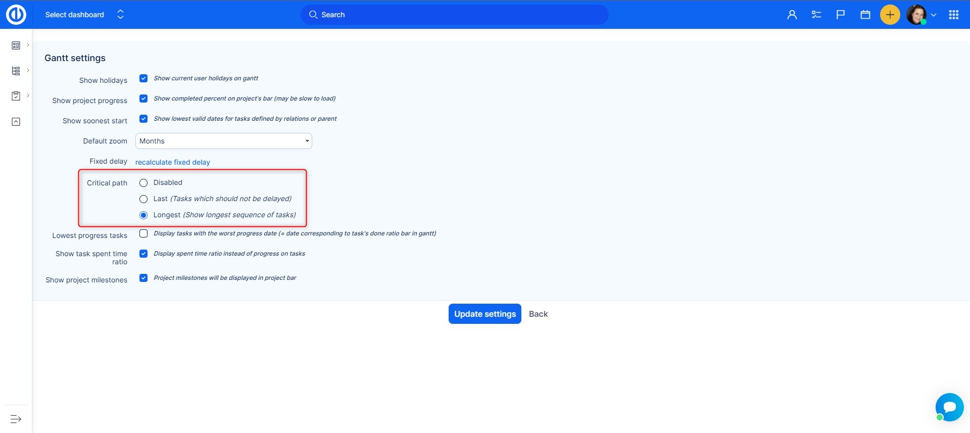 Settings of the Critical path can be modified in global Gantt settings, which is accessible via a small toothed wheel at the top right. The following options are available.