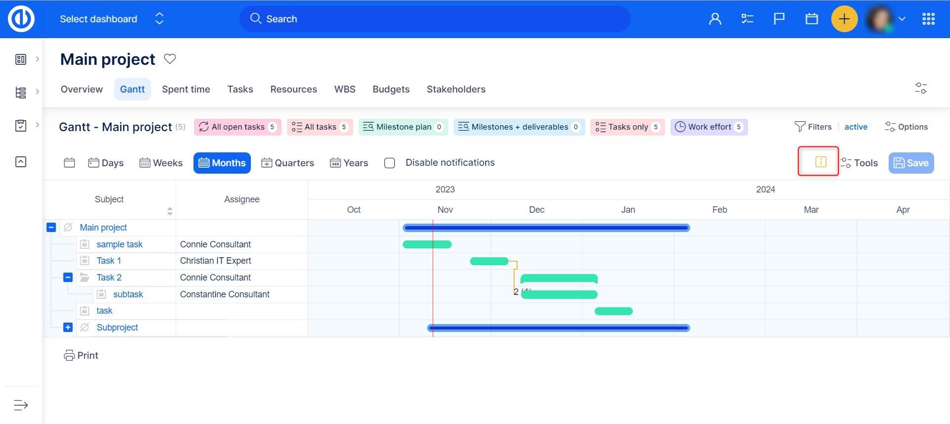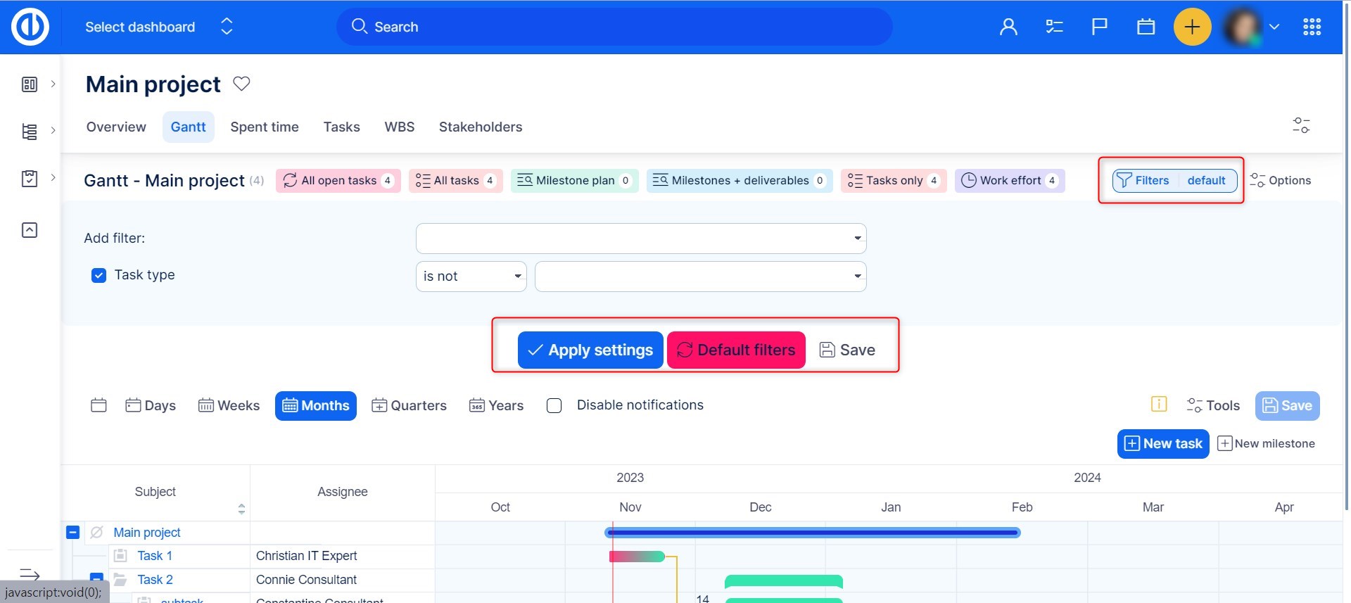 How to work with tasks filters & options above Gantt