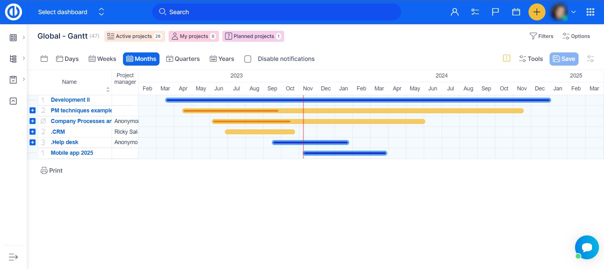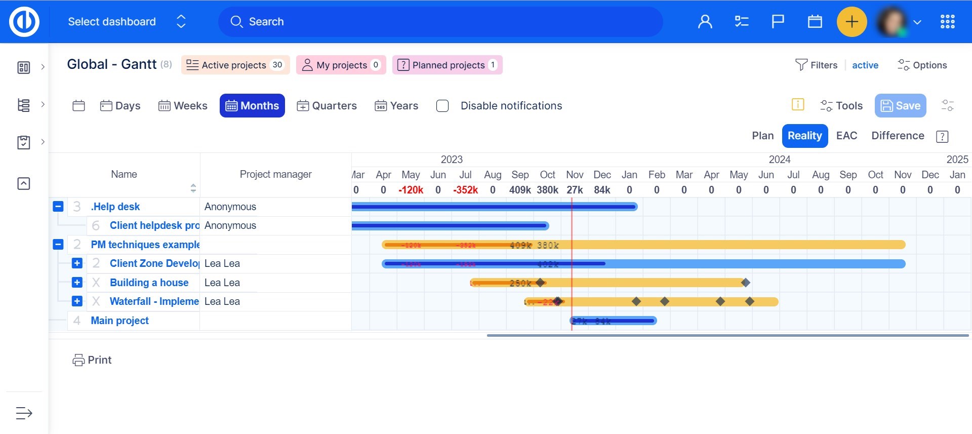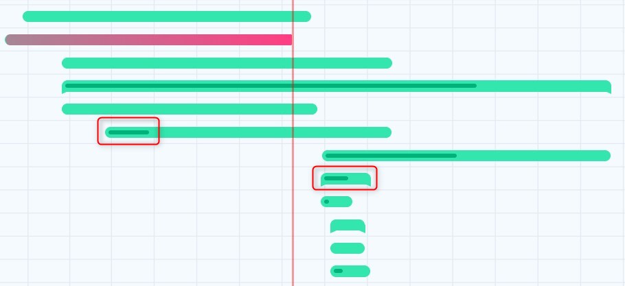- The red color of project bars in the global Gantt: When the % of completion displayed in a project bar is not long enough to reach the actual date (red line), the project is colored in red. The same applies to projects where progress is less than 100 % and their due date is in the past.