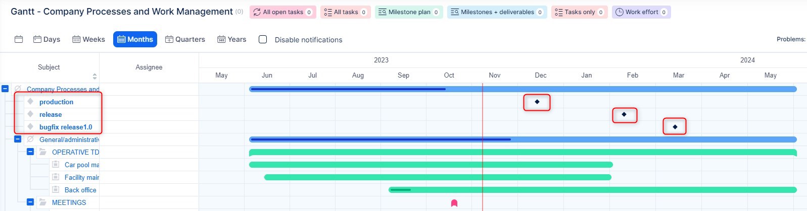 - Closed milestones are not displayed in Easy Gantt, therefore, any task placed under such a milestone will be shown like without a milestone.