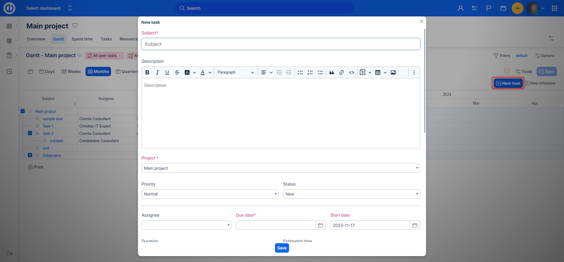 - When editing a task using Quick task editor, the changes will not be saved unless the user clicks on the Save button in the top right corner of the timeline window. Only the following fields are saved automatically: Description, Tasks, Comments, Log time, Tags, Coworkers, Custom fields.