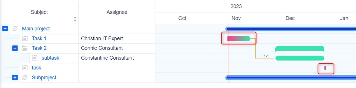 - In case that task start/due date is calculated from subtasks and cross-project parent-child relationships are enabled, it may happen that the visible length (=duration) of a task on Gantt timeline is sometimes displayed incorrectly. It happens when a subtask from another project has been added to that task.
