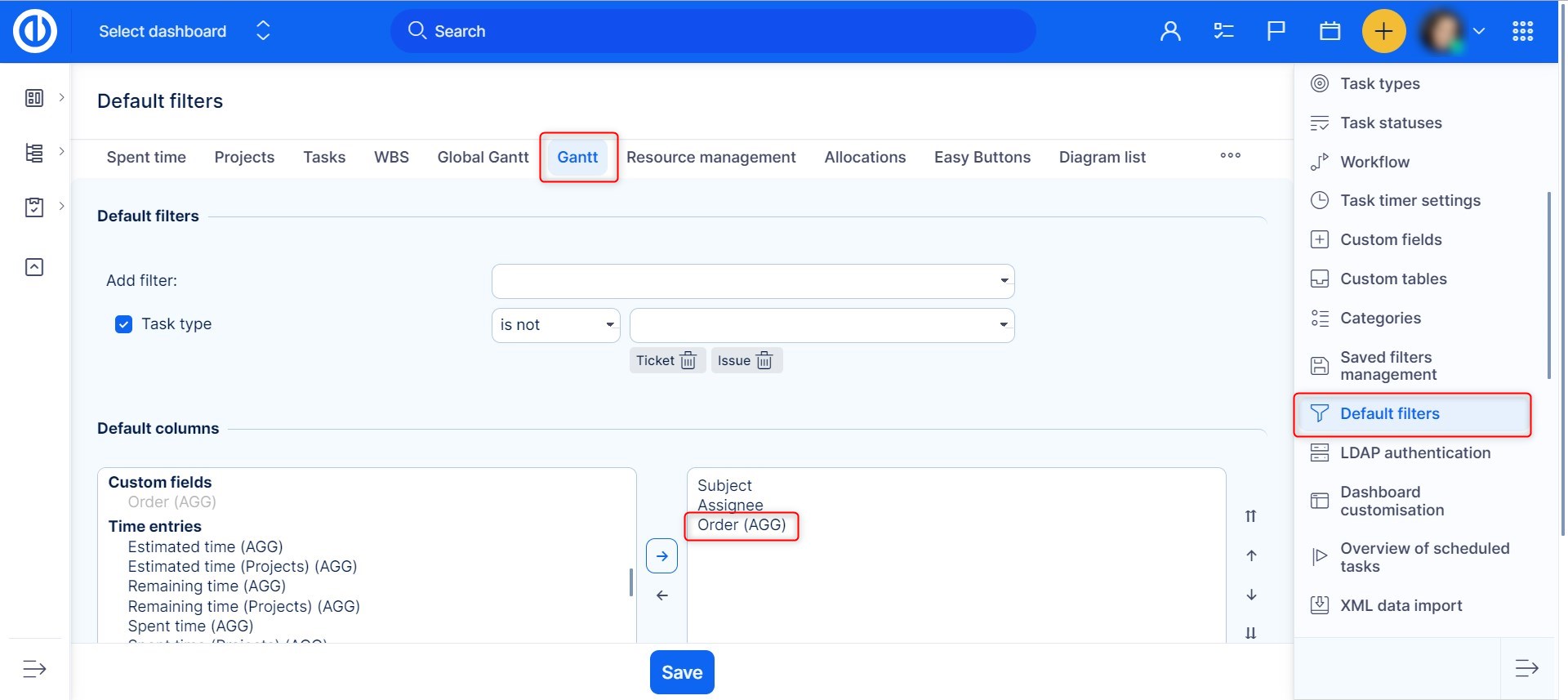 Then go to More: Administration: Filter settings: Easy Gantt & Resource management and add the custom field "Order" into default columns visible in Easy Gantt by moving it from the left side to the right.
