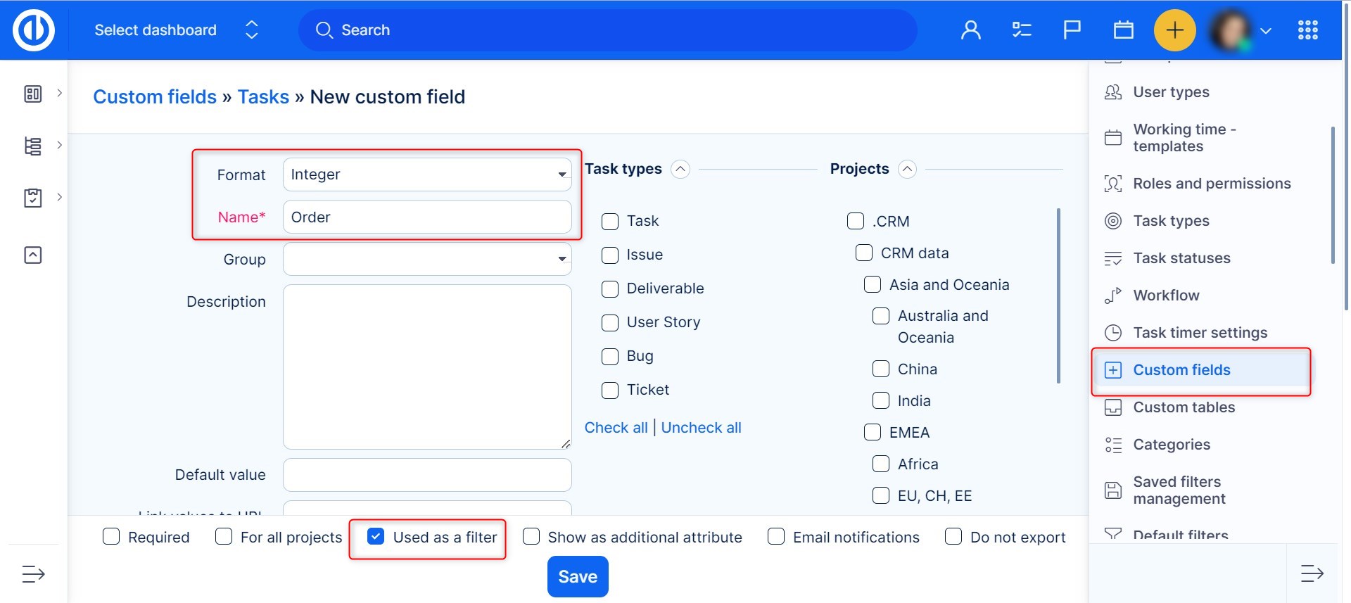 Nevertheless, there is a workaround to re-sort tasks as well as projects by any attribute in ascending or descending order. To give an example, create a task custom field named Order, format integer and check used as a filter as illustrated below.