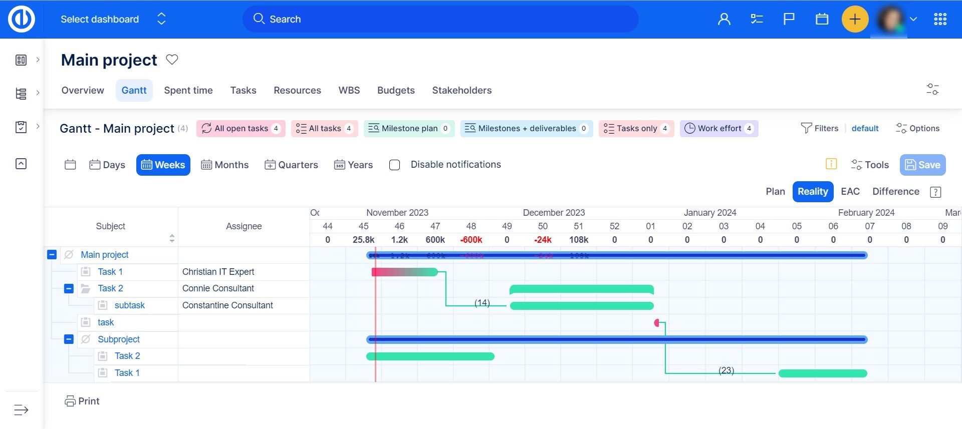 Clicking on it adds a new horizontal line to the timeline. This line shows numbers representing the balances of planned incomes and expenses per selected period (day, week, month). To edit these balances, use Project Budgets module. The balances per individual projects are shown in the respective project bars. When you open a parent project using [+] button, it will show details per subprojects as well. To hide cash flow on the Gantt chart, click again on the Cash flow button.
