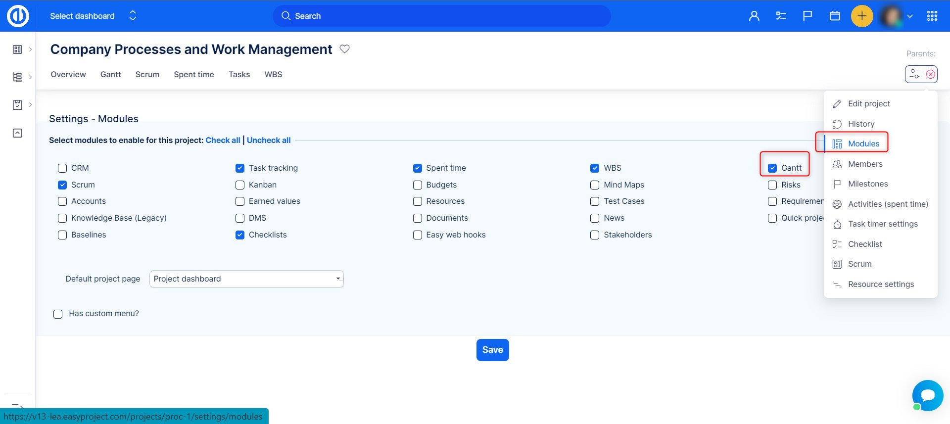 Now, let's have a look at Easy Gantt on the project level. Before you can access it from a project, you need to activate the particular module in project's settings as shown in the image below.