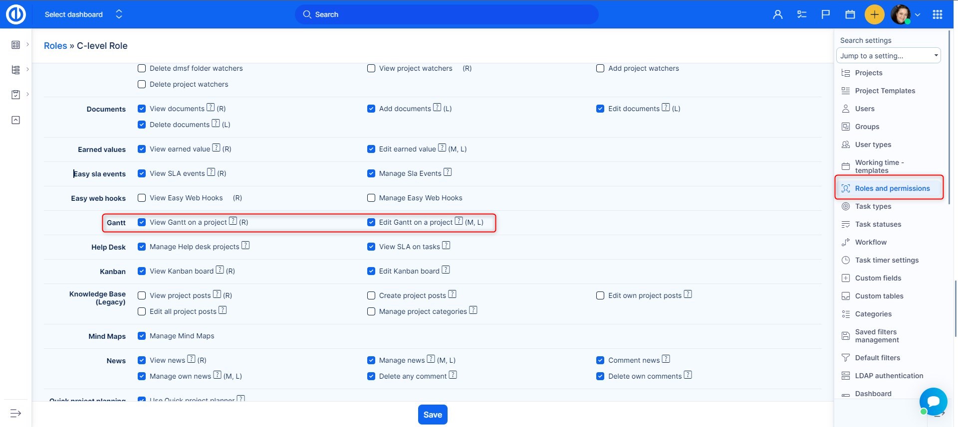The permissions for Easy Gantt can be set up in Global menu >> Administration >> Roles and permissions >> Gantt (both in global permissions and project permissions). Moreover, the Edit button (enabling you to work with Gantt) is only available when the permission "Manage tasks relations" is enabled (can be found under Roles and permissions >> Project permissions >> Task tracking - Manage task's relations).