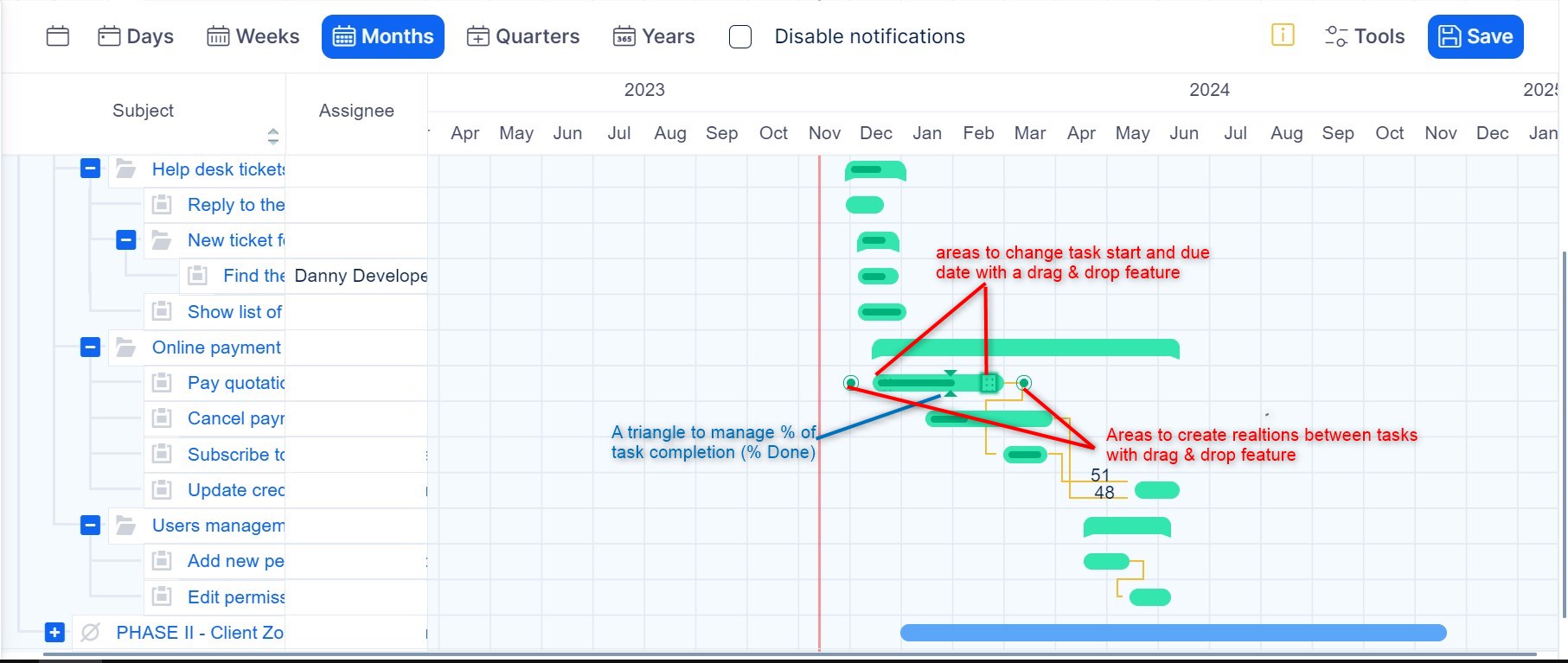 - Large involvement of drag & drop feature reduces the need for keyboard control (you can move tasks, projects and milestones on a timeline and thus plan them, you can also create relations between the entities just with your mouse)