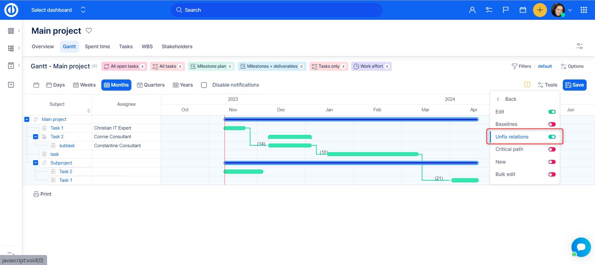 This button will enable you to add relations and change progress bar directly in the Gantt chart. When this toggle is disabled, you are able to only move the bars in time.