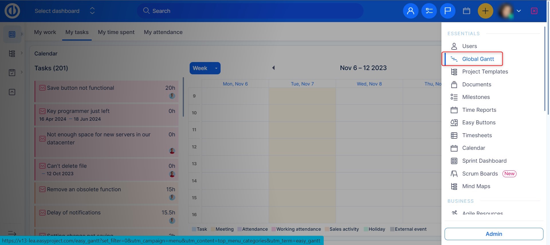 Easy Gantt is available both on the global level and the project level. To access it from the global level, go to Global menu >> Easy Gantt as shown on the image below.