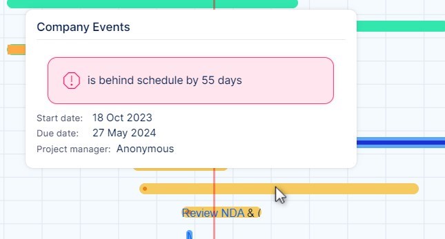 If you move the mouse button over any project on the timeline in the global Gantt, a warning message will appear in the tooltip if the completion of the project is delayed by a certain number of days compared to today.