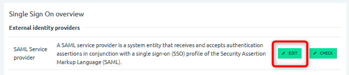 Configuration is done by clicking on EDIT at SAML Service provider and requires to enter information available to Entra ID admins.