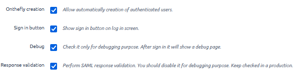 - Sign in button - should be enabled during your first attempts of configuration before rolling to production. It will ensure the user will always see login page with a button for SAML login, even in case of incorrect SAML configuration. It will help you with debug. If disabled, user is logged in automatically.