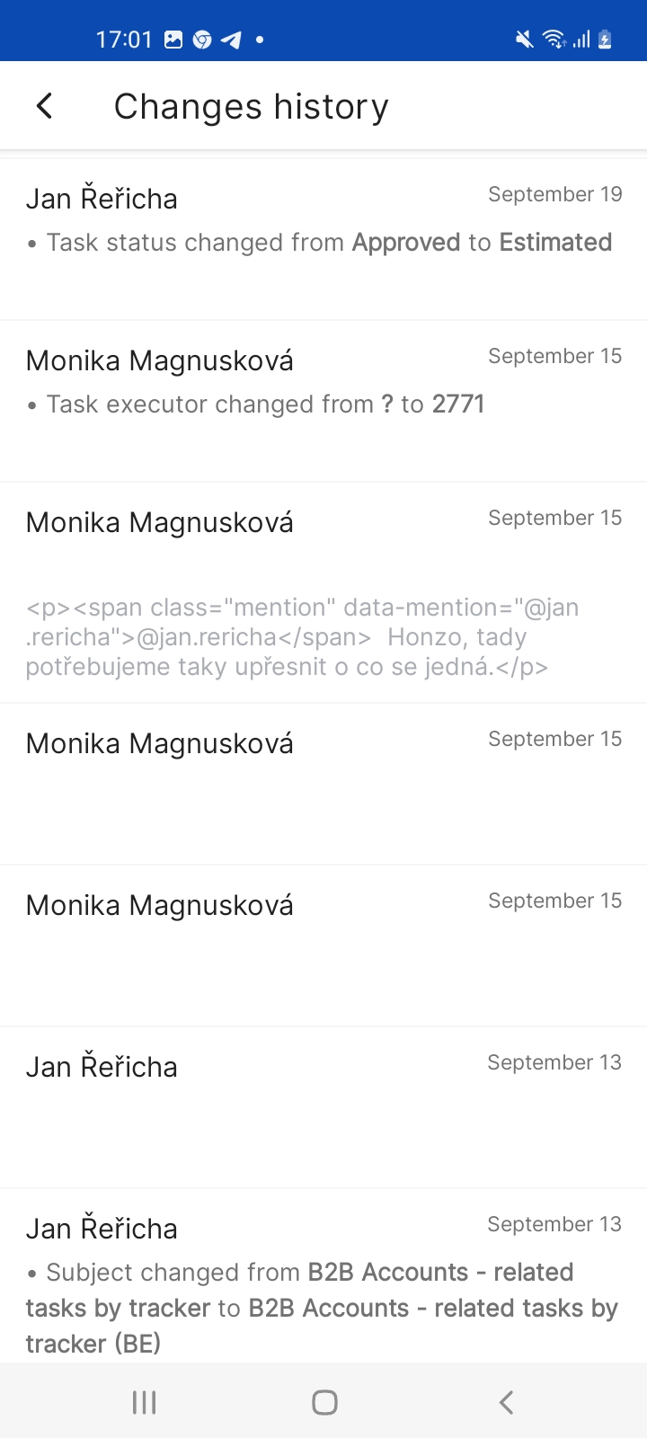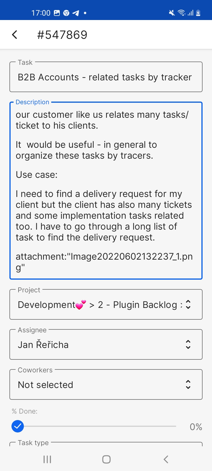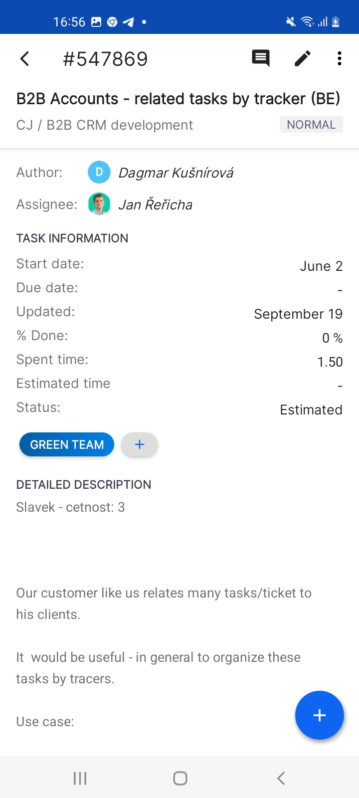 On the Tasks page, Click on any single task to view its detail or hold your finger on it to display the context menu (edit task, add to home screen, start working). To create a new task, just click the big plus icon in the lower right corner of the task list. When you click the big plus icon on the task detail, you will see more options you can do with the task (add related tasks, add coworker, log time, add subtask, start working, attach files). Using the icons in the top-right corner, you can add a comment to the task, edit the task, open the task in a browser, view the history of changes, or add the task to the home screen.