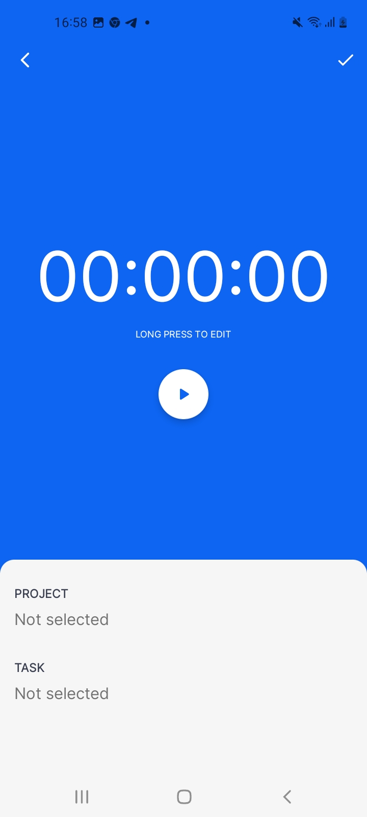 On the Timers page, click the big plus icon in right down corner to create a new task timer. Then simply select the project and task to count the spent time on and press the Play button to start the timer. When you finish working on that task, click the Pause button to save your spent time record (the form will open automatically). You can then find your timer in the timers' list so you can resume counting spent time later. To delete a timer, slide it to the right with your finger.