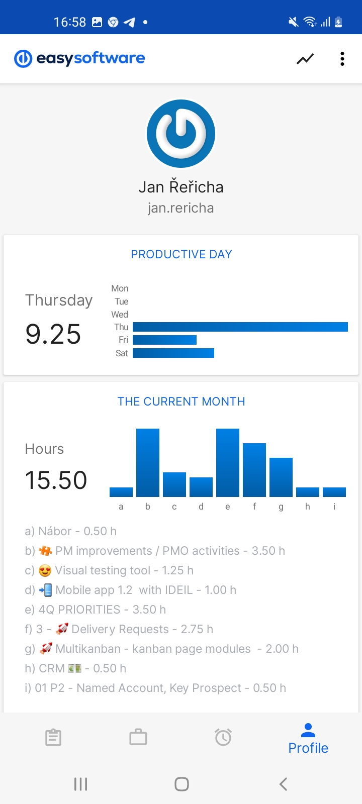 - Personal statistics – know immediately how much you worked this week or month