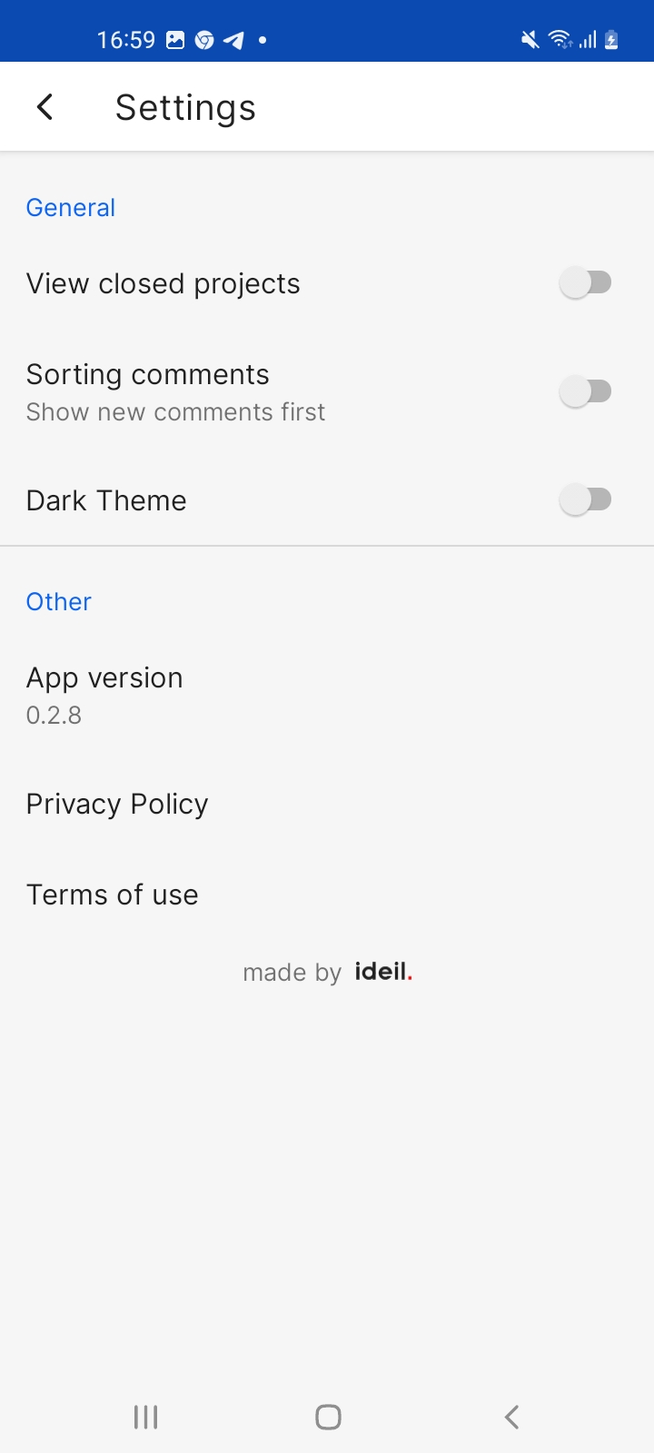 On the Settings page, you can change the color of task priorities, view closed projects, sort comments as per your criteria, activate the dark theme, or read about privacy policy and terms of use.