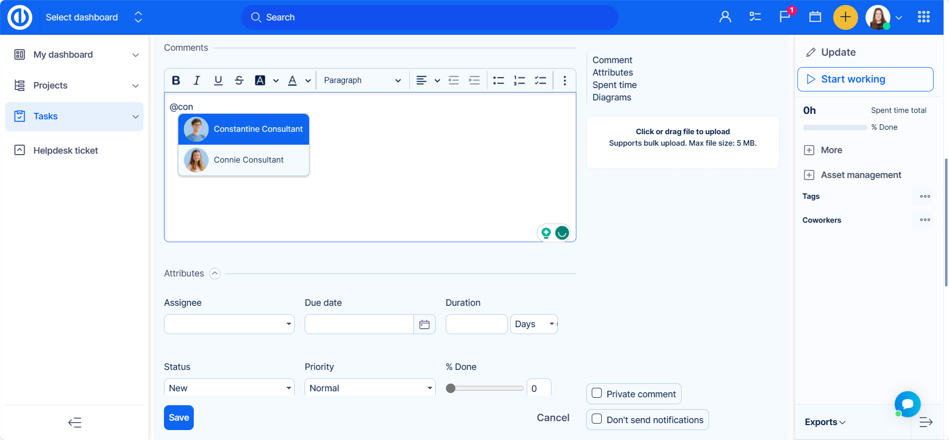 - While it's possible to mention a user in the task description, it won't generate a notification. To ensure the user receives the notification, it is advised to mention them in the comments or add them as coworkers.