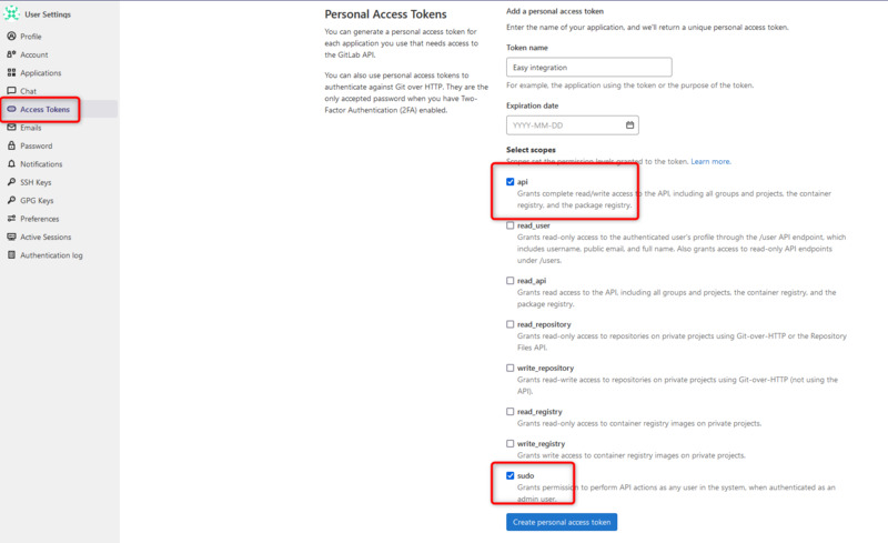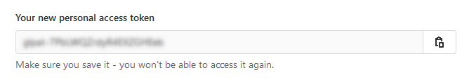 - Go to Access tokens, select all permissions and Create personal access token