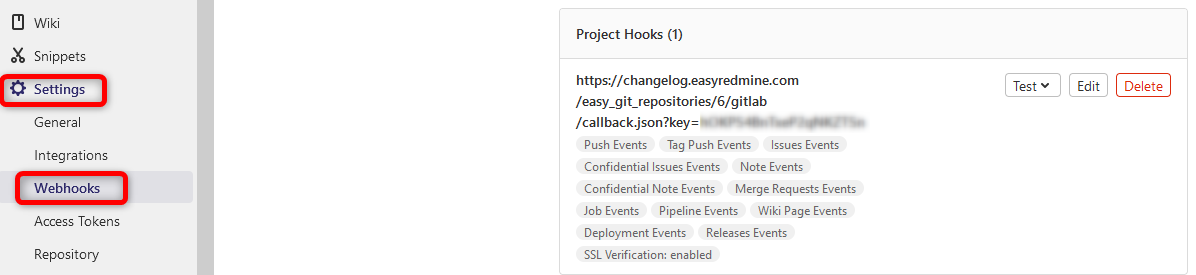 New data from GitLab are sent to Easy8 via webhooks configured in GitLab. Under normal circumstances, they are created automatically. You can verify this in your GitLab project >> Settings >> Webhooks