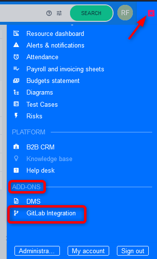 Finally, we are reaching the fun part. What the integration actually does for the users. Access the main page/dashboard of GitLab integration via More menu (top right) under section Add-ons.