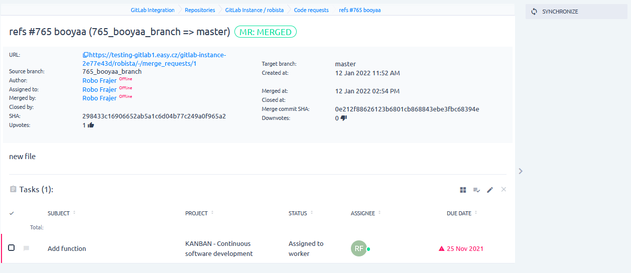 - Clicking on Synchronize will update all data of this MR from GitLab