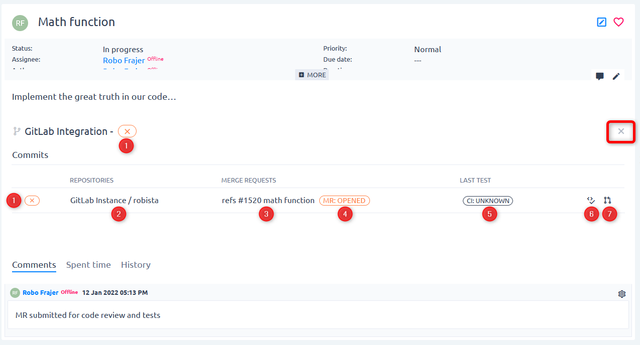 4 Status of each merge request. By clicking on it you will be redirected to the merge request detail in GitLab.