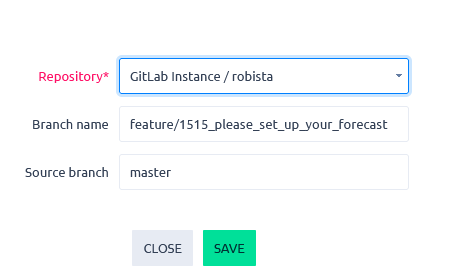 Choose the repository in the autocomplete field. Branch name is prefilled with task ID and subject, but you can change it. Source branch is prefilled by master