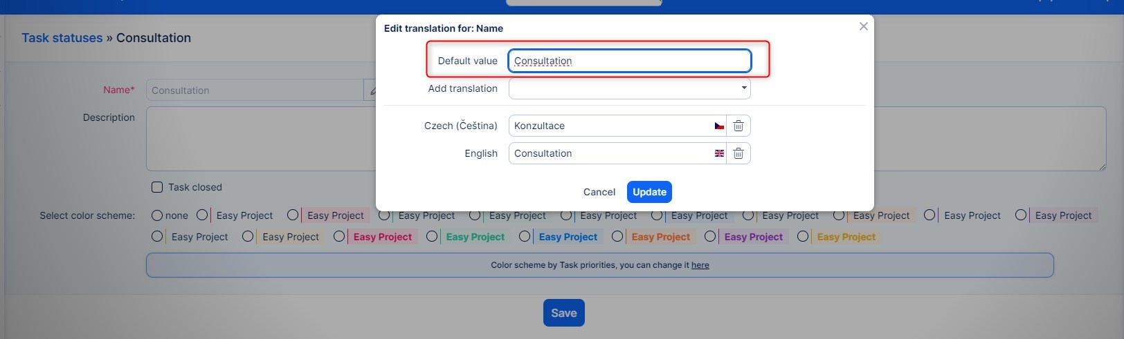 - Tasks cannot be closed via e-mail as such behavior would conflict with Help desk functionality. If an e-mail arrives containing a closed status (i.e. status is marked as "is closed"), the system automatically selects the default status for the given tracker instead.