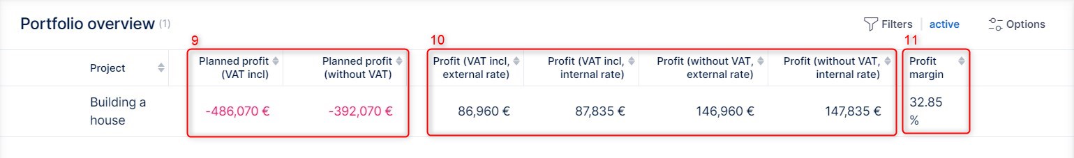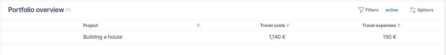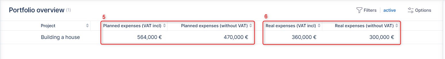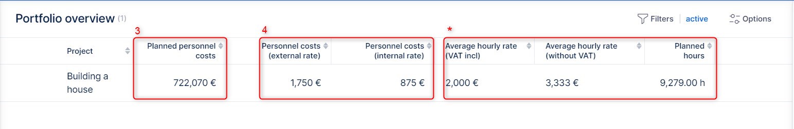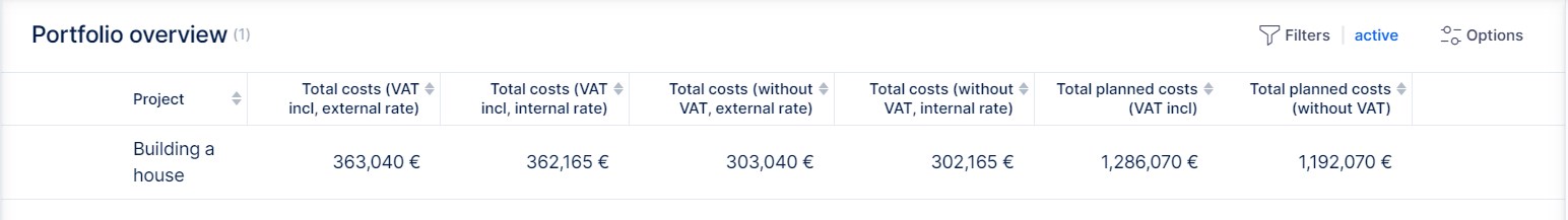 In portfolio overview, you can view all combinations of expenses (with or without VAT) and personnel costs (internal or external rate).