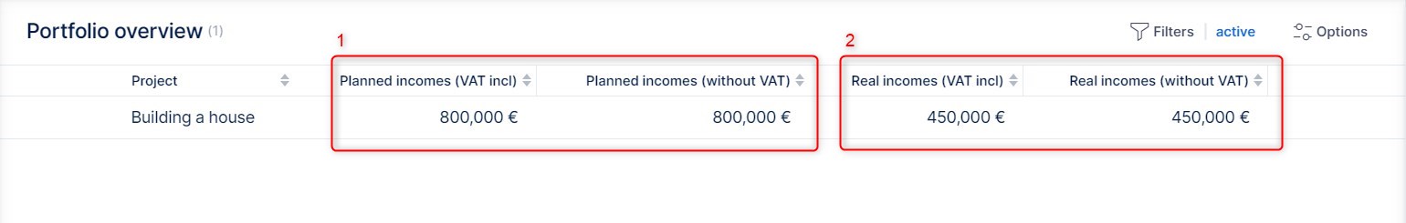 1) Planned incomes - Incomes entered in the planned budget. Amount may be shown including or without VAT, according to the budget setting