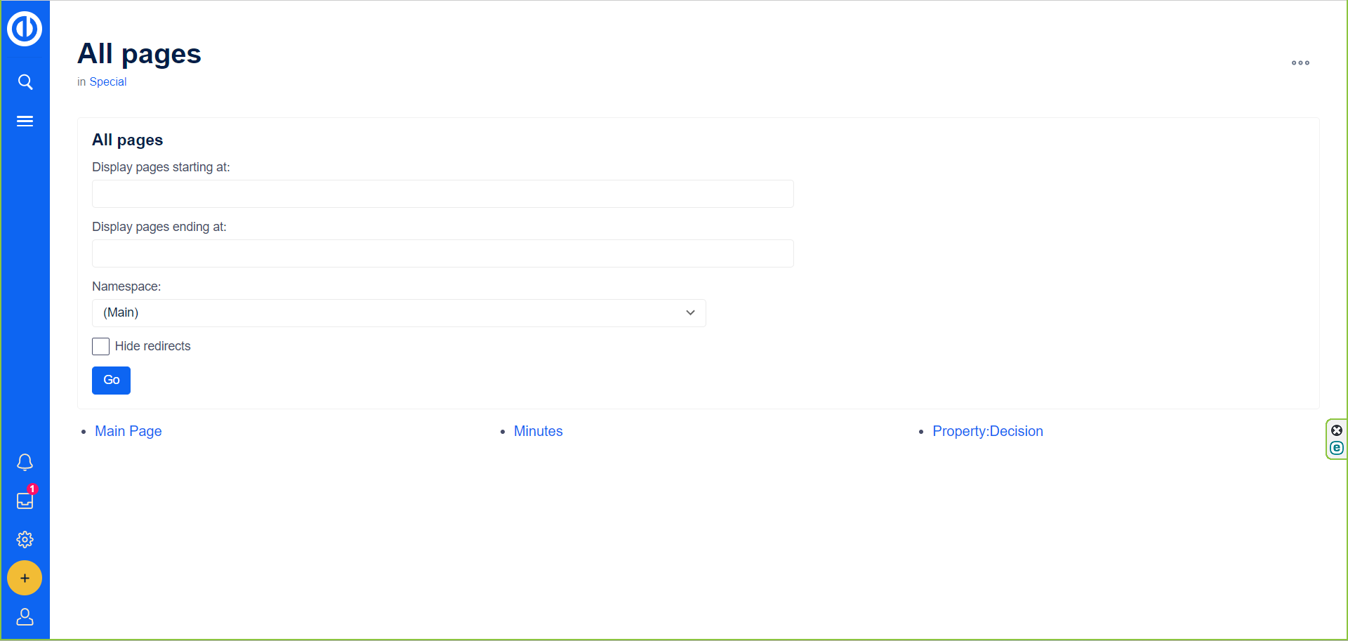 - Access "All pages" by going to the page Special:All pages, usually linked from the main navigation.