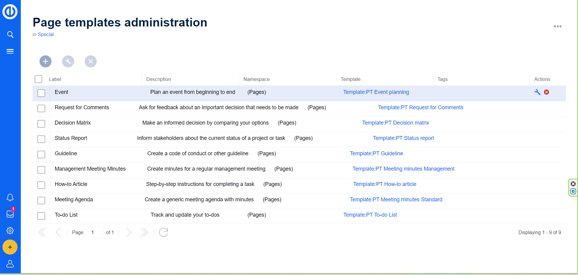 Managing Standard Page Templates: Standard templates, once installed, can be deleted from Global actions > Management > Page templates. Deleting a template removes it from the selection during page creation but not from the Template namespace.